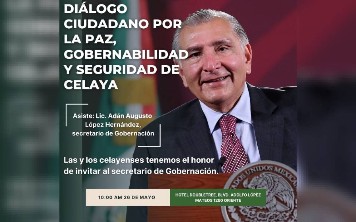 CELAYA, Gto. (OEM-Informex).- El Secretario de Gobernación, Adán Augusto López Hernández, sostendrá una reunión con empresarios y líderes sociales denominada “Diálogo ciudadano por la paz, gobernabilidad y seguridad de Celaya”.