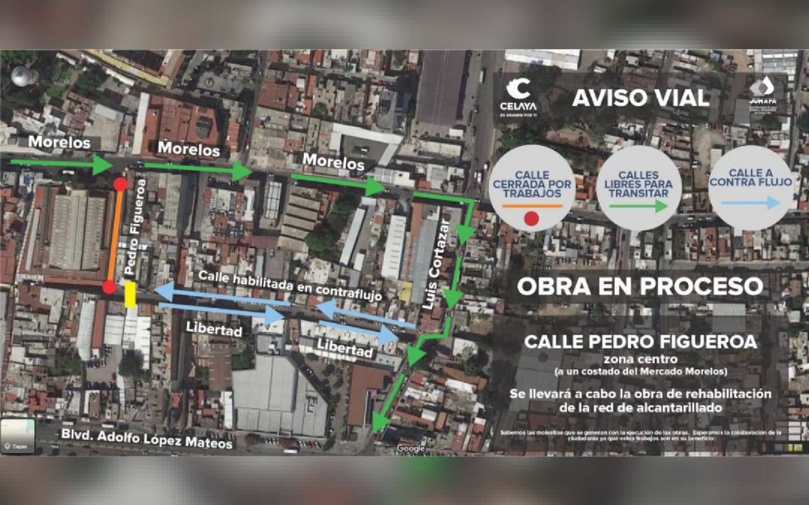 CELAYA, Gto. (OEM-Informex).- A partir del 1 de junio será cerrada la calle Pedro Figueroa en el centro de la ciudad, a un costado de Mercado Morelos, debido a que la Junta Municipal de Agua Potable y Alcantarillado de Celaya (JUMAPA) iniciará trabajos para la habilitación de la red de drenaje sanitario, en el tramo que comprende de la calle Morelos a Libertad.