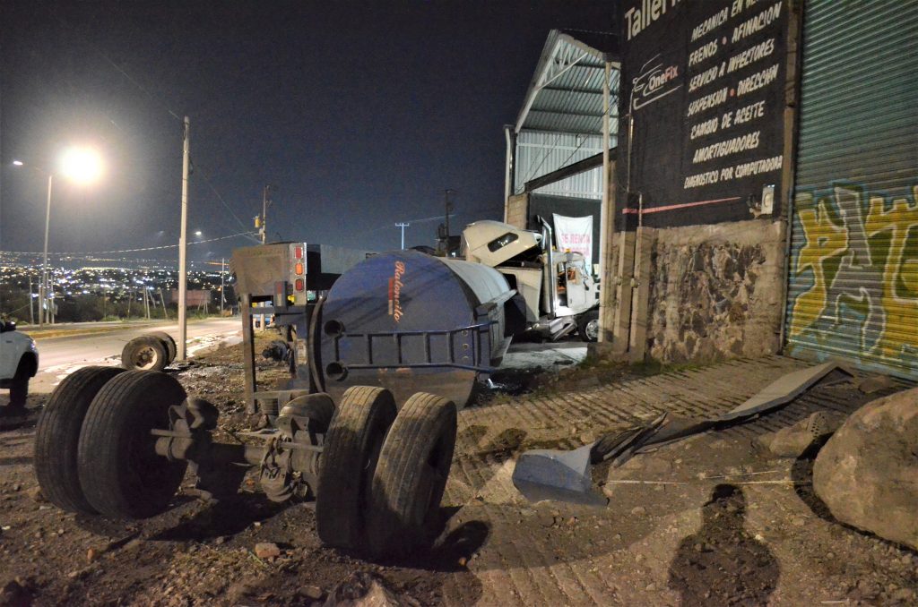 Una pipa que circulaba ayer por la noche sobre la carretera a Chichimequillas, en una zona en descenso y en curva, al quedar sin frenos se proyectó contra una bodega, en donde quedó volcada. El operador resultó con lesiones menores tras el fuerte impacto.
