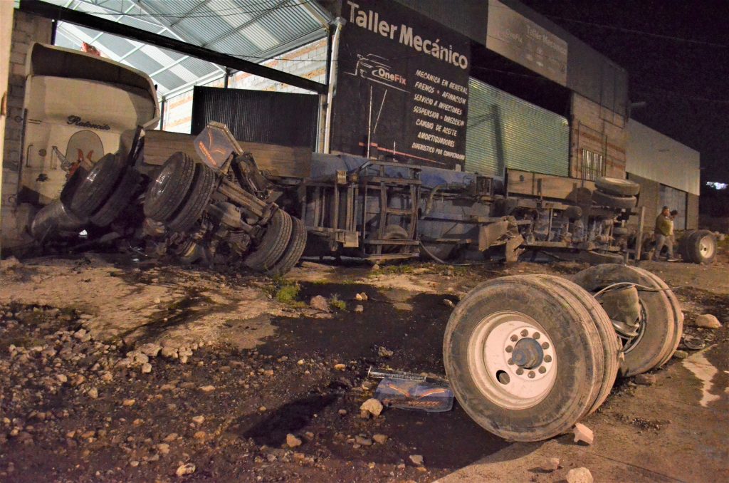 La pipa se proyectó hacia el lado derecho, en su trayecto primeramente pegó contra una roca de tamaño considerable, la cual movió de su sitio, enseguida, con la parte frontal se impactó contra la fachada y zaguán de una bodega, quedando el remolque volcado y con los ejes desprendidos.