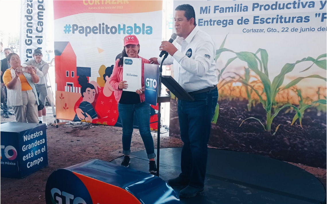 En cuanto a programa de regularización de asentamientos irregulares, dijo que: “Como dice el dicho, por qué digo que la burra es parda, porque traigo los pelos de la burra en la mano, y por qué digo que esta casa es mía, pues porque tengo la escritura, aquí es mi casa, “Papelito habla” se trata de darle certeza jurídica a sus familias porque no queremos heredarles problemas a nuestros hijos”.