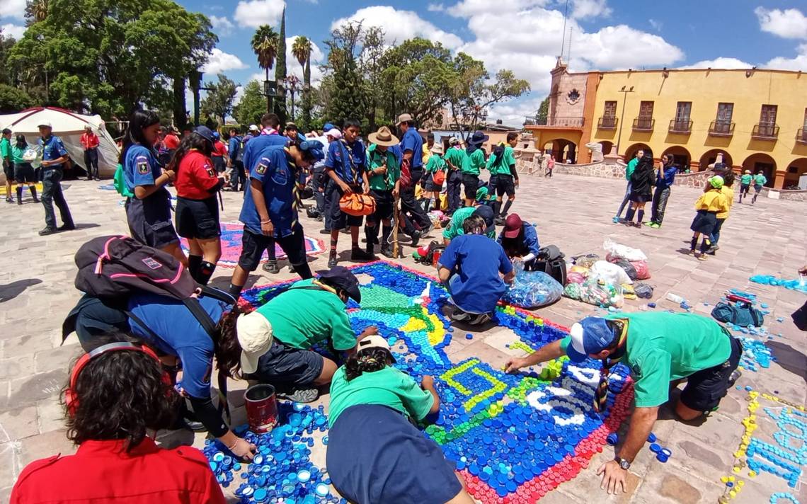 Desde las 6 de la mañana jóvenes Scouts de diferentes lugares del Estado de Guanajuato se reunieron para realizar con las tapas recolectadas un tapete del escudo de cada grupo y con latas aplastadas realizaron la flor de lis, el símbolo scout a nivel mundial.