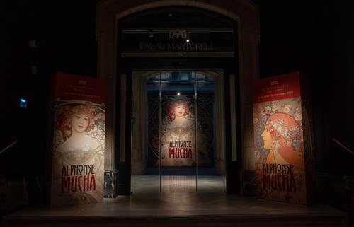 Exposición dedicada al artista checo Alphonse Mucha (1860-1939), uno de los máximos exponentes del art nouveau, reúne más de 80 piezas de la galería Mucha Trust, entre las que destacan sus famosos carteles dedicados a La Divina Sarah Bernhardt, así como objetos comerciales con sus diseños, fotos y dibujos; permanecerá en el Palau Martorell de Barcelona hasta el 15 de octubre. En la imagen, la entrada de la exposición.