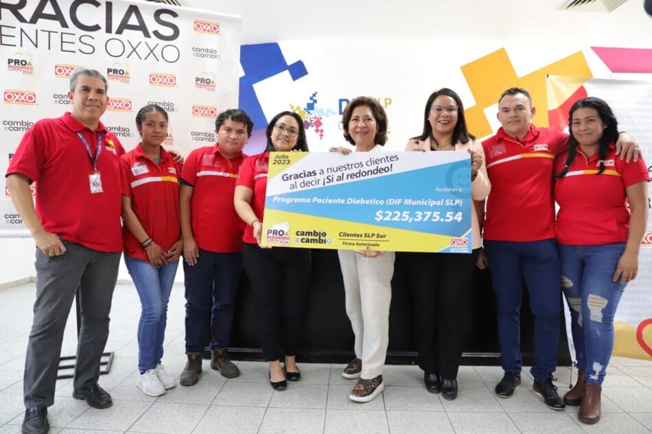 La Presidenta del DIF Municipal de San Luis Capital, Estela Arriaga Márquez, recibió de manos de Judith Oros Juárez, Gerente para San Luis Potosí Sur de la Cadena Comercial Oxxo, un cheque por más de 220 mil pesos correspondientes al donativo que se recaudó de enero a junio por medio del redondeo en la campaña ‘Promoviendo la salud en México, Cambio X Cambio’.