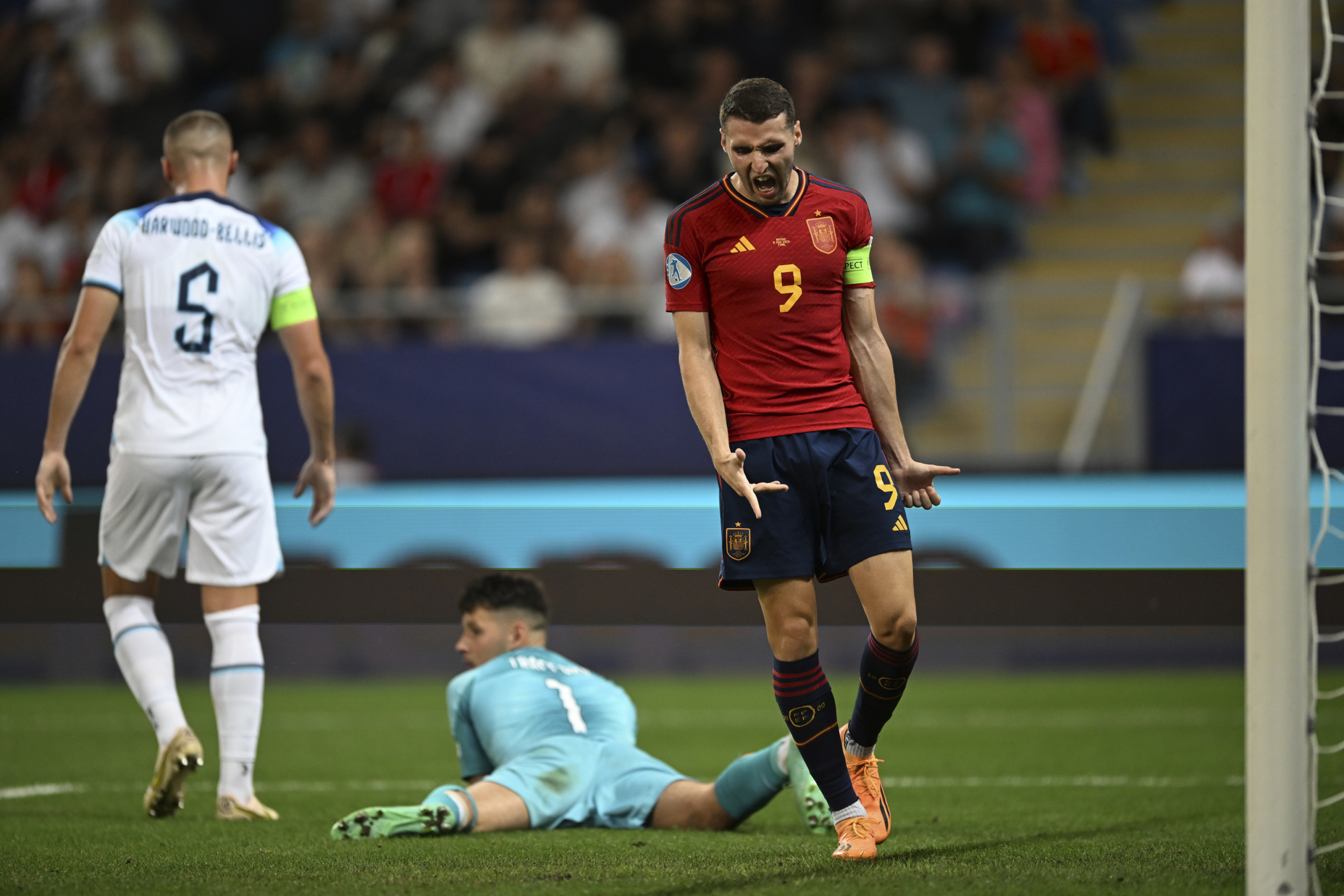 A pesar de que Antonio Blanco, Oihan Sancet y un sobrexcitado Baena haban conseguido cortocircuitar a Curtis Jones y Angel Gomes, al equipo de Lee Carsley le bastaban latigazos de sus hombres de ataque para poner en problemas a Espaa. El primer aviso claro fue un remate a la escuadra de Colwill en un saque de falta. Al filo de descanso, Inglaterra se volc y tuvo premio a baln parado. El guante del descarado Cole Palmer sorte la barrera en un saque de falta que el VAR vio que roz Jones incrustado en la barrera para engaar a Arnau Tenas pero no anul pese a su dudosa legalidad. Pens el jugador de City que era suyo el gol y lo celebr en las narices del banquillo espaol. La trifulca acab con dos expulsiones de los asistentes de los entrenadores: Carlos Rivera y Ashley Cole. Como en todo el campeonato, los ingleses haban exprimido los detalles para ponerse en ventaja y arrimarse al ttulo.