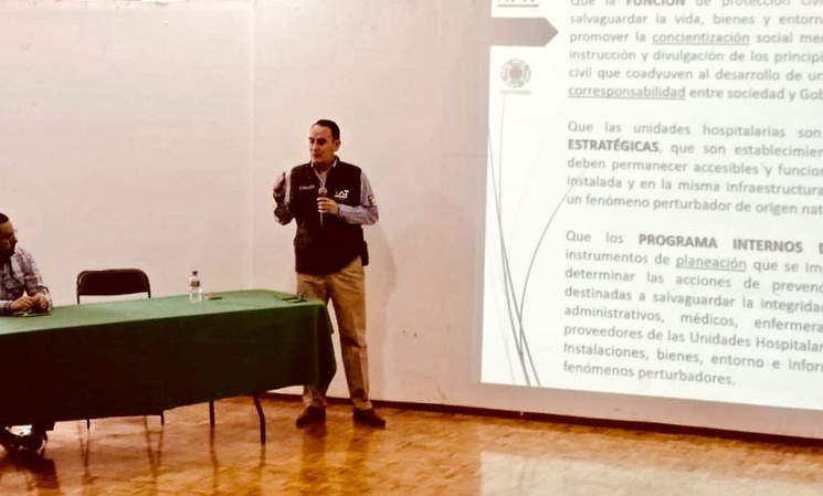 El director de Protección Civil, Diego Gallegos Romero, destacó que las unidades médicas y hospitalarias son “consideradas instalaciones vitales y estratégicas cuyos servicios deben permanecer accesibles y funcionando a su máxima capacidad instalada y en infraestructura, inmediatamente después de un fenómeno perturbador de origen natural o humano”.