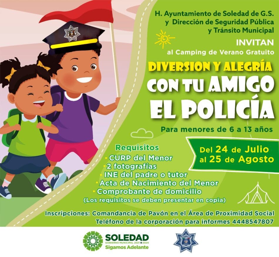 Seguridad Pública de Soledad de Graciano Sánchez a través del área de Proximidad Social comenzarán con el Camping de Verano «Diversión y Alegría con tu Amigo El Policía», que será totalmente gratuito para niñas y niños de 6 a 13 años de edad, mismo que comenzará el próximo 24 de julio.