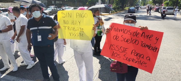 Acapulco, Gro. Unos 50 trabajadores eventuales del hospital del Instituto de Seguridad y Servicios Sociales de los Trabajadores del Estado (Issste) bloquearon desde las 9:00 de la mañana la avenida Costera Miguel Alemán, a unos metros de la delegación del Issste que se encuentra en el centro de Congresos Copacabana -en la zona Dorada del puerto- justo en el cruce con la calle Palmas del fraccionamiento Club Deportivo para exigir a autoridades el pago pendiente de siete quincenas.