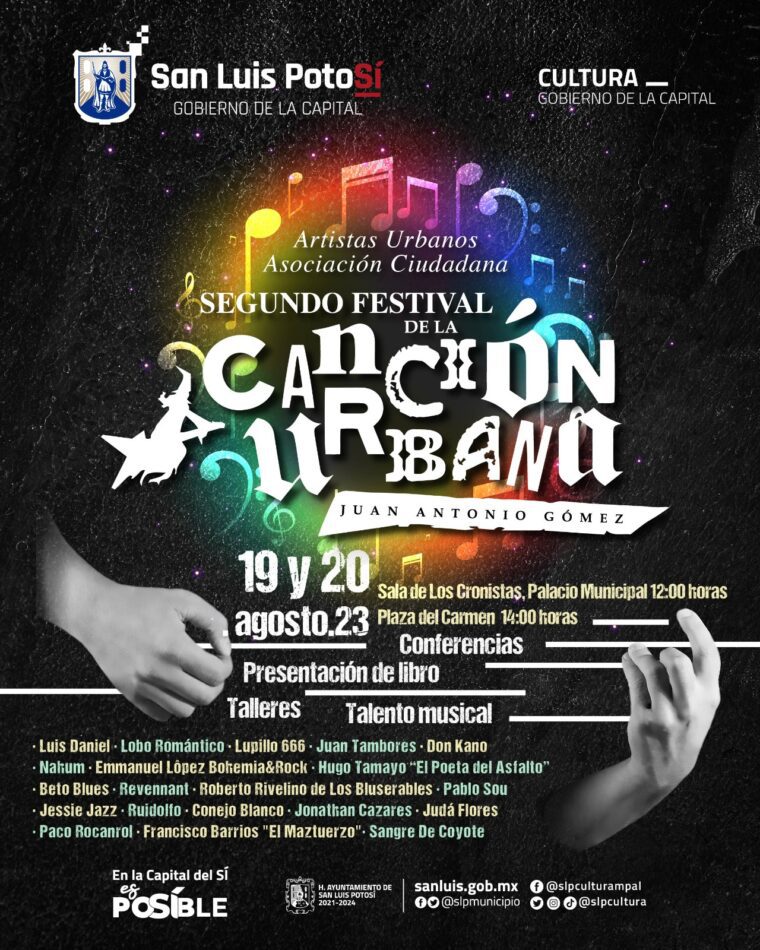 La Dirección de Cultura Municipal apoya por segundo año consecutivo a los artistas urbanos en la organización del 2º. Festival de la Canción Urbana “Juan Antonio Gómez”, mismo que se realizará el 19 y 20 de agosto en la escalinata del Teatro de La Paz, y con actividad alternativa en el Centro Cultural Palacio Municipal.
