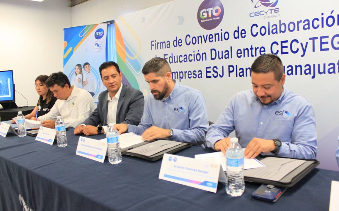 Juventino Rosas, Gto.- (OEM-Informex).- El Centro de Estudios Científicos y Tecnológicos del Estado (CECyTE) realizó la firma de un convenio de colaboración para la Educación Dual con la Empresa ESJ, Planta Guanajuato.