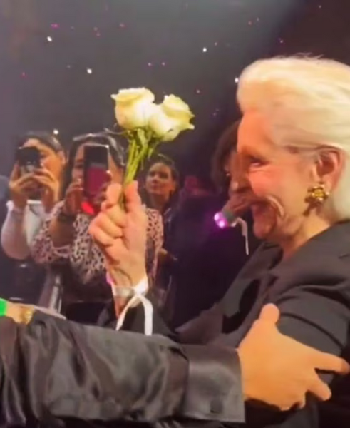 Al percatarse de la presencia de Carolina, Micky descendió del escenario para entregarle un pequeño ramo de rosas blancas, brindándole un abrazo caluroso y besos en la mejilla que marcaron el momento, mientras los asistentes en primera fila grababan y disfrutaban del momento.