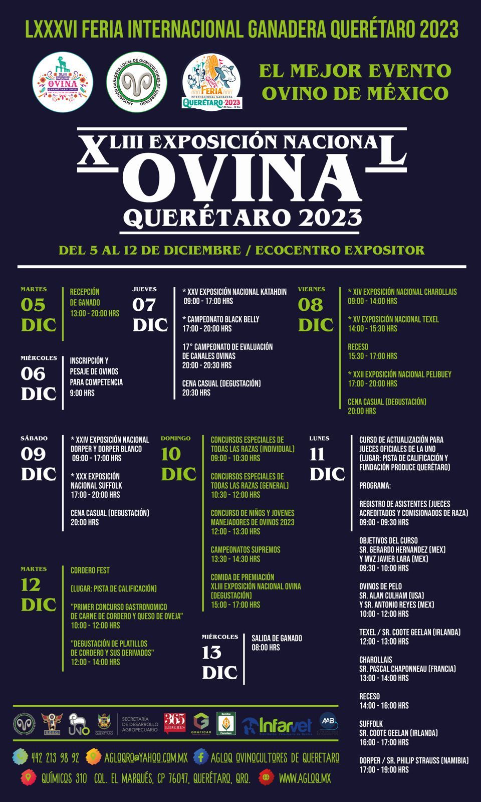 Habrá el Campeonato de Black Belly y el 17° Campeonato de Evaluación de Canales Ovinas, el 8 de diciembre, y el 11 de diciembre los concursos especiales de todas las razas, individual y general y los Campeonatos Supremos, donde saldrán los mejores ejemplares de todas las razas, así como el Concurso de Niños y Jóvenes Manejadores de Ovinos.