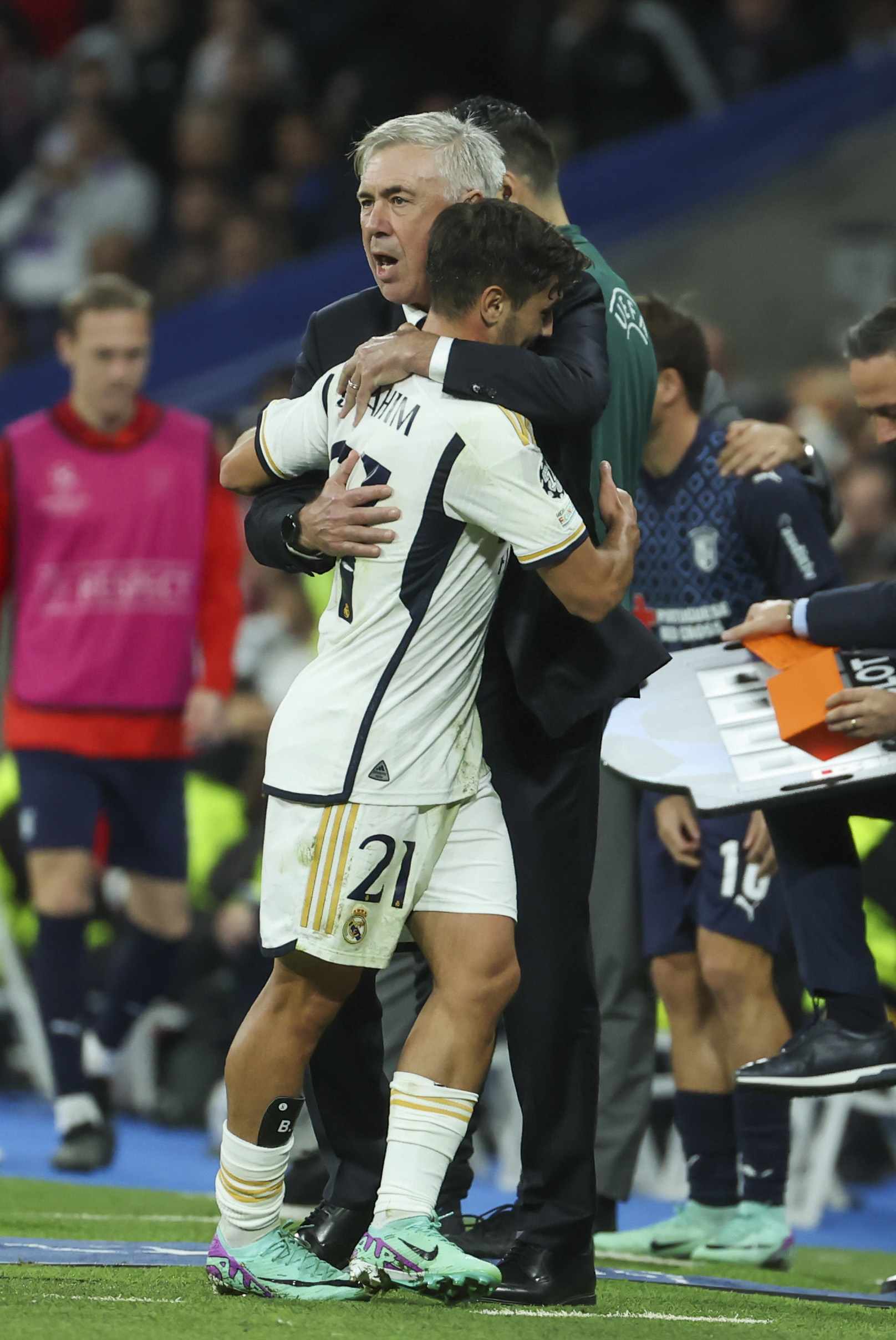 Por delante del andaluz, la dupla brasilea. Rodrygo sumaba un gol en Liga y otro en Champions y Vinicius dos y uno, por lo que ver puerta les subira la moral en un ataque madridista necesitado de sumar piezas ms all de Bellingham. Lo intentaron sin xito en la primera parte, pero tras el descanso encontraron su camino. Vini, que haba recibido unos tmidos pitos en los primeros 45 minutos y no anotaba desde el 7 de octubre, marc el segundo. Y Rodrygo, picando el baln con calma ante la salida de Matheus, el tercero. Rabia lgica en sus celebraciones. Era cuestin de tiempo que marcaran, valor Ancelotti, que se abraz a Rodrygo al final: Le tena que dar las gracias, dijo el brasileo. Lo mismo que Brahim, que elogi al tcnico: Le tengo que agradecer la confianza. Habl conmigo y yo lo que quiero hacer es ayudar al equipo, asegur.