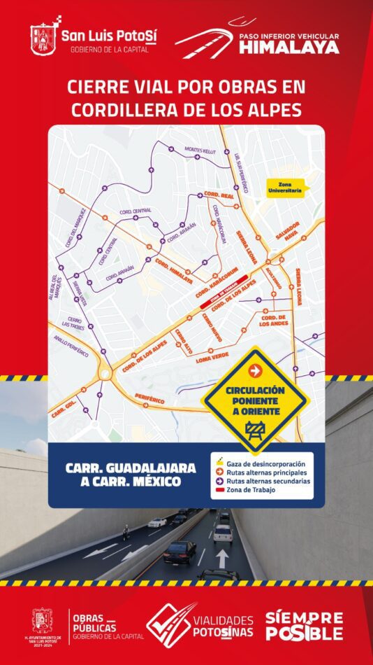 A partir de este martes 21 de noviembre, el Gobierno de la Capital mediante el programa municipal Vialidades Potosinas, inicia los trabajos para la construcción del Paso Inferior Vehicular Himalaya, en el tramo que baja del puente Sierra Leona hasta la altura de la tienda comercial Wal-Mart, por lo que será necesario el cierre a la vialidad en carriles centrales de la avenida Cordillera de Los Alpes en ambos sentidos. Se permitirá circular por carriles laterales de Salvador Nava, además de que se permitirá únicamente la circulación local en calles aledañas.