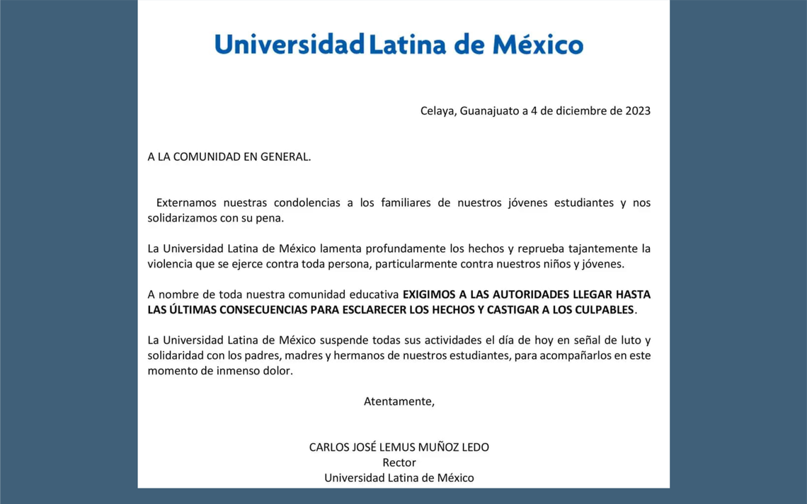 CELAYA, Gto.- La Universidad Latina de México, a través de un comunicado de prensa en su página oficial, dio las condolencias a familiares y amigos de los jóvenes estudiantes asesinados el domingo por la tarde, quienes fueron encontrado en el interior de un vehículo en el camino viejo a El Salitre.