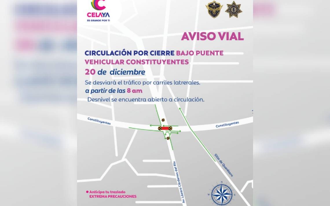 CELAYA, Gto.- La Dirección General de Tránsito y Policía Vial, informa que a partir de las 08:00 horas del día miércoles 20 de diciembre del año en curso, se cerrará el paso a la circulación vehicular, bajo el puente elevado para el retiro de infraestructura.