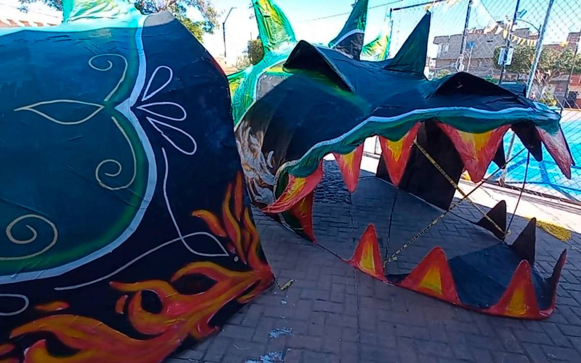 Explicó que “hace un año lo hicimos de nuevo porque estaba muy deteriorado. Afortunadamente este 2023 se pudo rescatar el dragón y por eso solo fue necesario restaurarlo. Nosotros somos de oficio pintores y solo trabajamos por la tarde y nos aventamos entre 15 y 20 días en ratitos de dos horas haciéndolo todo, es decir, se le da la forma del dragón con una base de alambrón, varilla y alambre, después se entretela, se empapela, se pinta y se amarra”.