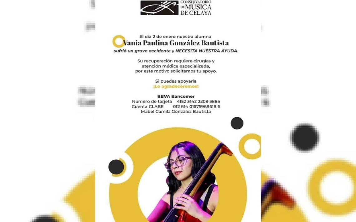CELAYA, Gto.- Debido a un fuerte accidente que sufrió la estudiante del Conservatorio de Música y Artes de Celaya, Vania Paulina González Bautista, en su natal Oaxaca, su familia, así como los directivos de la institución, solicitan el apoyo económico de la ciudadanía para solventar los gastos que ascienden a más de 50 mil pesos.