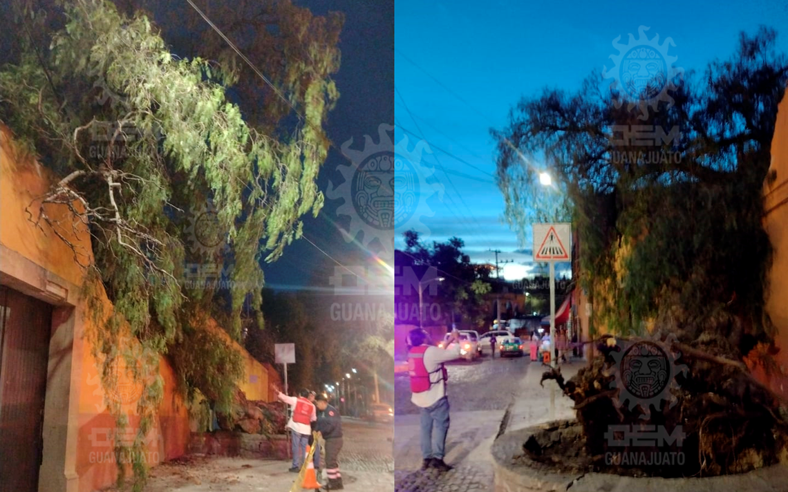 SAN MIGUEL DE ALLENDE, Gto.- Los fuertes vientos que se registraron este día en San Miguel de Allende lograron derrumbar un árbol muy grande que se encontraba afuera de la secundaria Leobino Zavala, donde afortunadamente aún no hay alumnos.