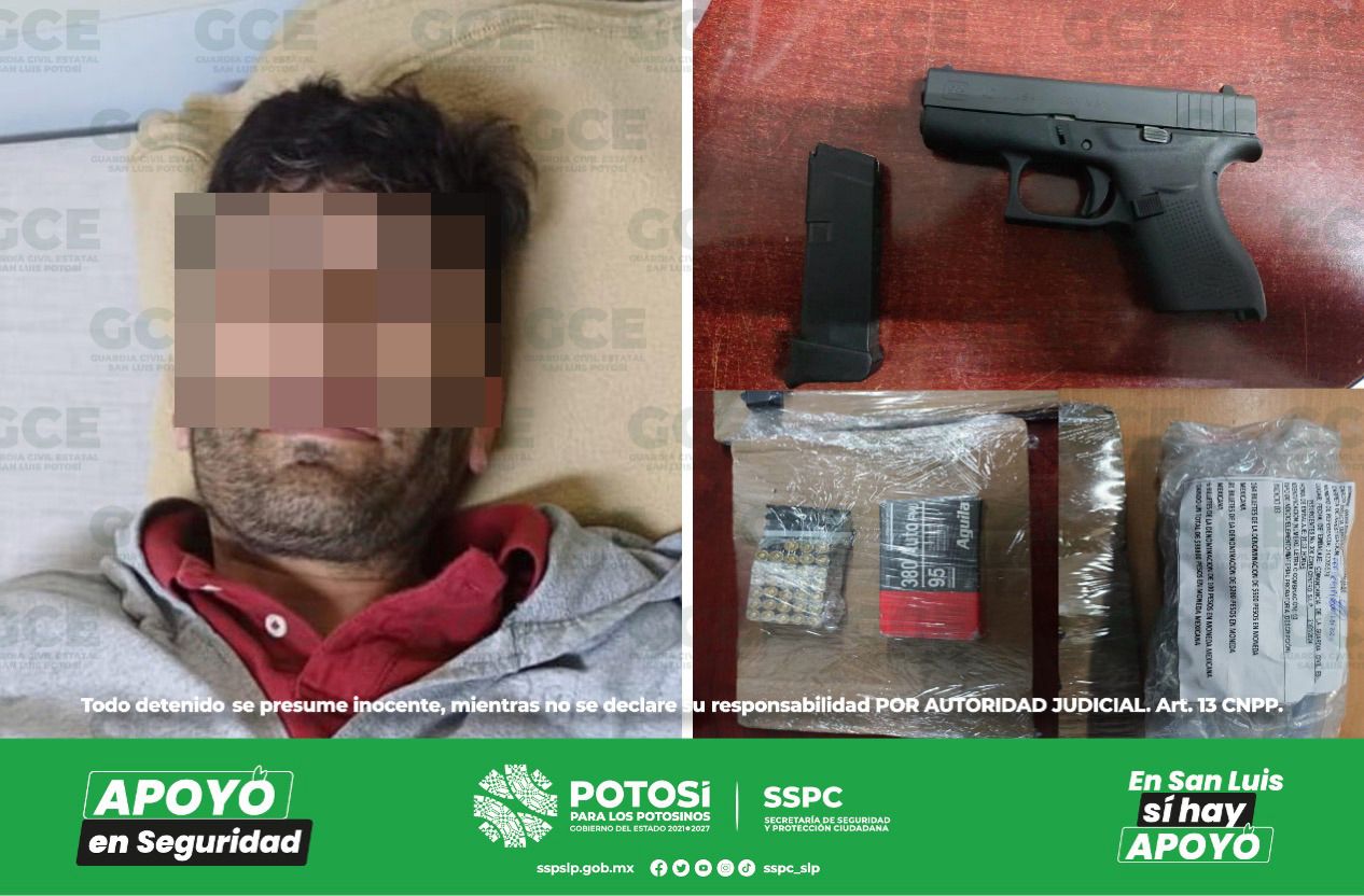 Soledad de Graciano Sánchez, S.L.P.- Durante los operativos de seguridad y vigilancia, desarrollados por oficiales de la Guardia Civil Estatal (GCE), un presunto fue detenido con un arma de fuego y con cartuchos útiles y más de 98 mil pesos en efectivo.