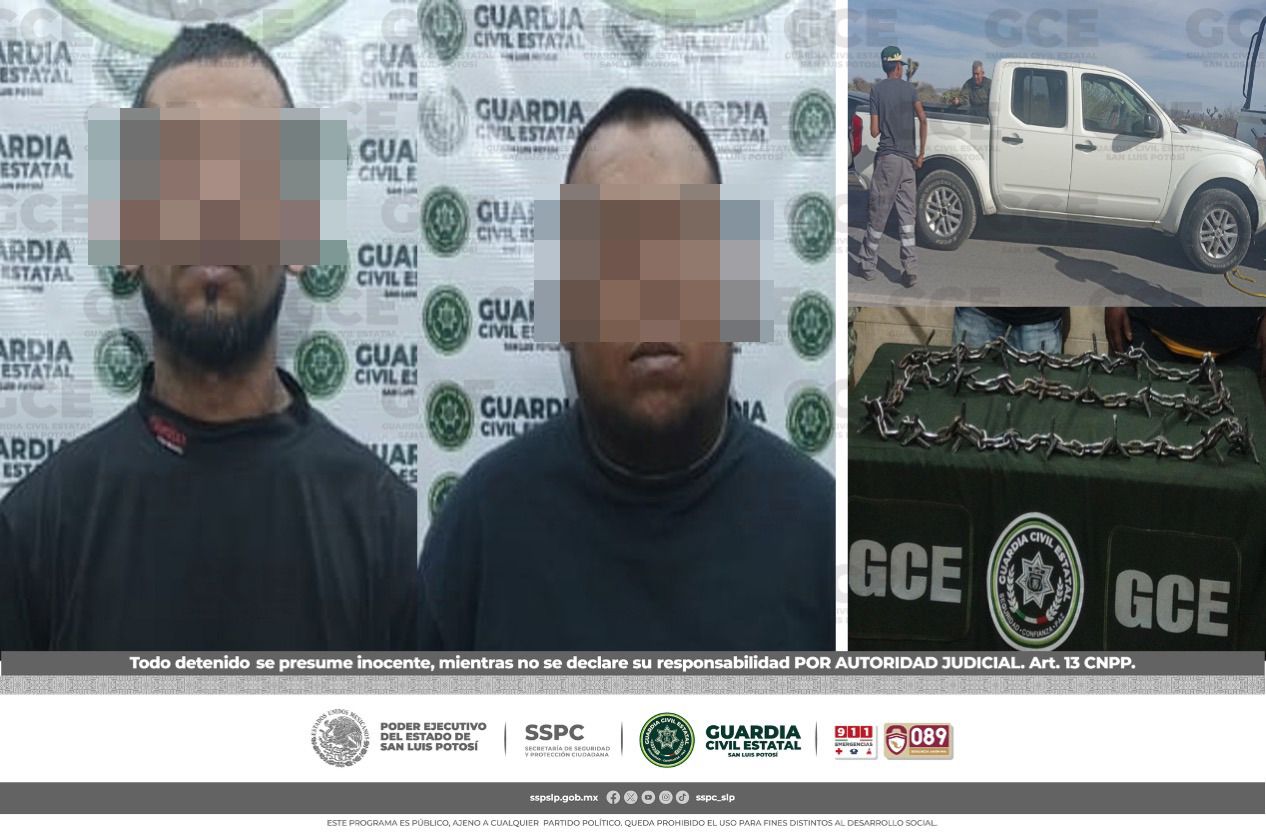 Los presuntos fueron detenidos luego de asegurarles la unidad que contaba con reporte de robo del 14 de febrero del año en curso, del municipio de Moctezuma. En el interior de la unidad se aseguró una cadena metálica de tres metros aproximadamente, adaptada con objetos de varilla conocidos como “poncha llantas”.
