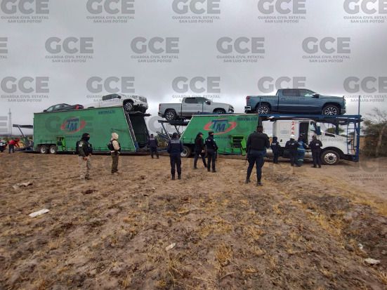Los hechos se suscitaron tras un reporte de un tractocamión en aparente estado de abandono, sobre la carretera federal 57 S.L.P.- Matehuala, lugar a donde arribaron los agentes estatales y municipales, teniendo contacto en el kilómetro 038+300 con una unidad tractocamión, modelo 2024, acoplado a dos semirremolques tipo madrina, los que transportaban cuatro vehículos marca Chevrolet, tipo Silverado, modelo 2024.