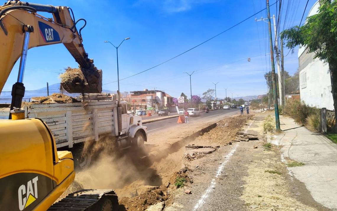 Parte de los trabajos que se realizan en Villas del Pedregal para la construcción del paso superior vehicular es la demolición de guarniciones y reubicación de arbolado y servicios sobre el camellón central, esto con la finalidad de contar con un carril de almacenamiento que permita la vuelta y desvío de flujo vehicular.