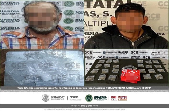 S.L.P.- Derivado de los trabajos de inteligencia, realizados por elementos de la Guardia Civil Estatal (GCE) dos presuntos narcomenudistas, vinculados a diversos grupos criminales, logrando asegurar 39 dosis de enervantes.