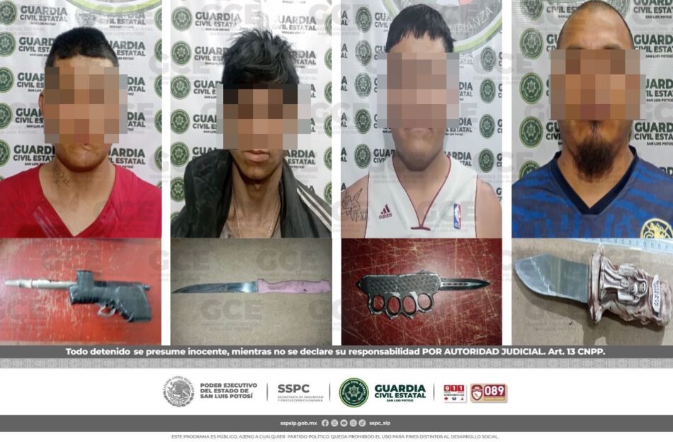 El primer hecho tuvo lugar en la colonia María Cecilia Tercera Sección, ahí fue detenido Josué “N” de 24 años de edad, detenido con una manopla metálica con una navaja; sobre la colonia General I. Martínez, oficiales de Guardia Civil Estatal y policía capitalina, detuvieron a Jesús “N” de 38 años, con un cuchillo; por su parte, en la colonia Satélite, Juan “N” de 27 años, quedó detenido al asegurarle un cuchillo entre sus ropas. Por último, en la colonia Providencia, Enrique “N” de 26 años, fue detenido con un arma de fuego de fabricación artesanal.