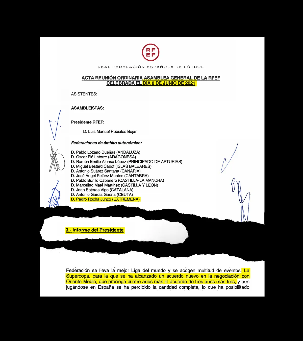 Pedro Rocha particip, en persona, en reuniones de la Junta Directiva y de la Asamblea de la Real Federacin Espaola de Ftbol en las que se abordaron cuestiones relacionadas con la Supercopa de Espaa en Arabia Saud. El actual presidente del organismo federativo neg ante la juez y el fiscal Anticorrupcin que investigan el ‘caso Rubiales’ haber tenido conocimiento alguno de los detalles del traslado de esta competicin al pas rabe y enfatiz