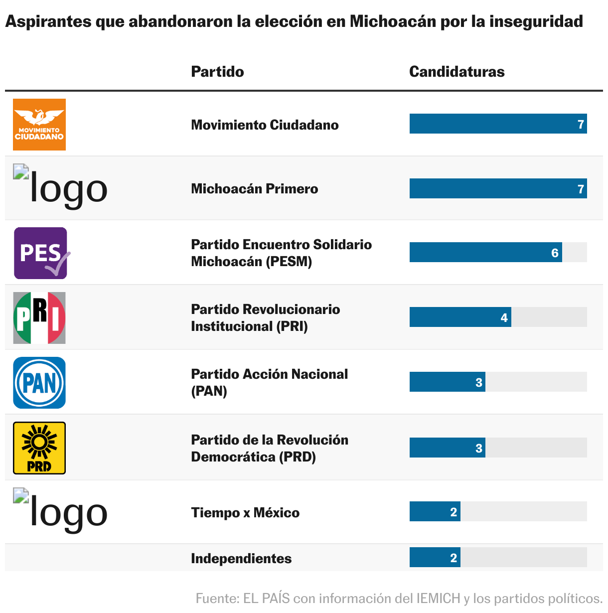 Las campañas ni siquiera habían empezado cuando el narco dio muestra de lo que era capaz en Michoacán. El morenista Miguel Ángel Zavala Reyes y el panista Armando Pérez Luna fueron asesinados a tiros el pasado 26 de febrero. Ambos eran aspirantes a la presidencia municipal de Maravatío y murieron con menos de 12 horas de diferencia. Dos días después de los atentados, el Partido Revolucionario Institucional (PRI) y el Partido de la Revolución Democrática (PRD) anunciaron que tres políticos perredistas y cuatro priistas se habían bajado de la contienda por la crisis de violencia que azota al Estado. A menos de un mes de los atentados, ya son al menos 34 personas que han optado por abandonar sus aspiraciones ante el clima de inseguridad que prima en la entidad, de acuerdo con los propios partidos políticos e información difundida por el Instituto Electoral de Michoacán (IEM). El fenómeno ha alcanzado a siete de los 11 partidos con registro estatal, así como a candidaturas independientes, según el recuento que ha hecho EL PAÍS.