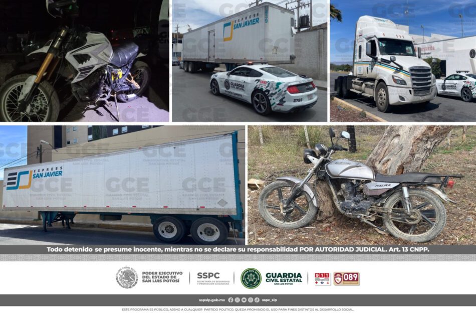 San Luis Potosí S.L.P.- Los dispositivos enfocados a la búsqueda y localización de vehículos con reporte de robo siguen generando buenos resultados por parte de la Guardia Civil Estatal; durante las últimas 24 horas se reportó el aseguramiento de cinco unidades con reporte de robo entre ellas dos cajas secas de transporte de carga, un tractocamión y dos motocicletas.
