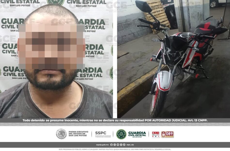 San Luis Potosí, S.L.P.- Dentro de los recorridos de seguridad y vigilancia, efectuados en la colonia Saucito, en la capital potosina, agentes de la Guardia Civil Estatal (GCE), detuvieron a un motociclista por probable manejo temerario.