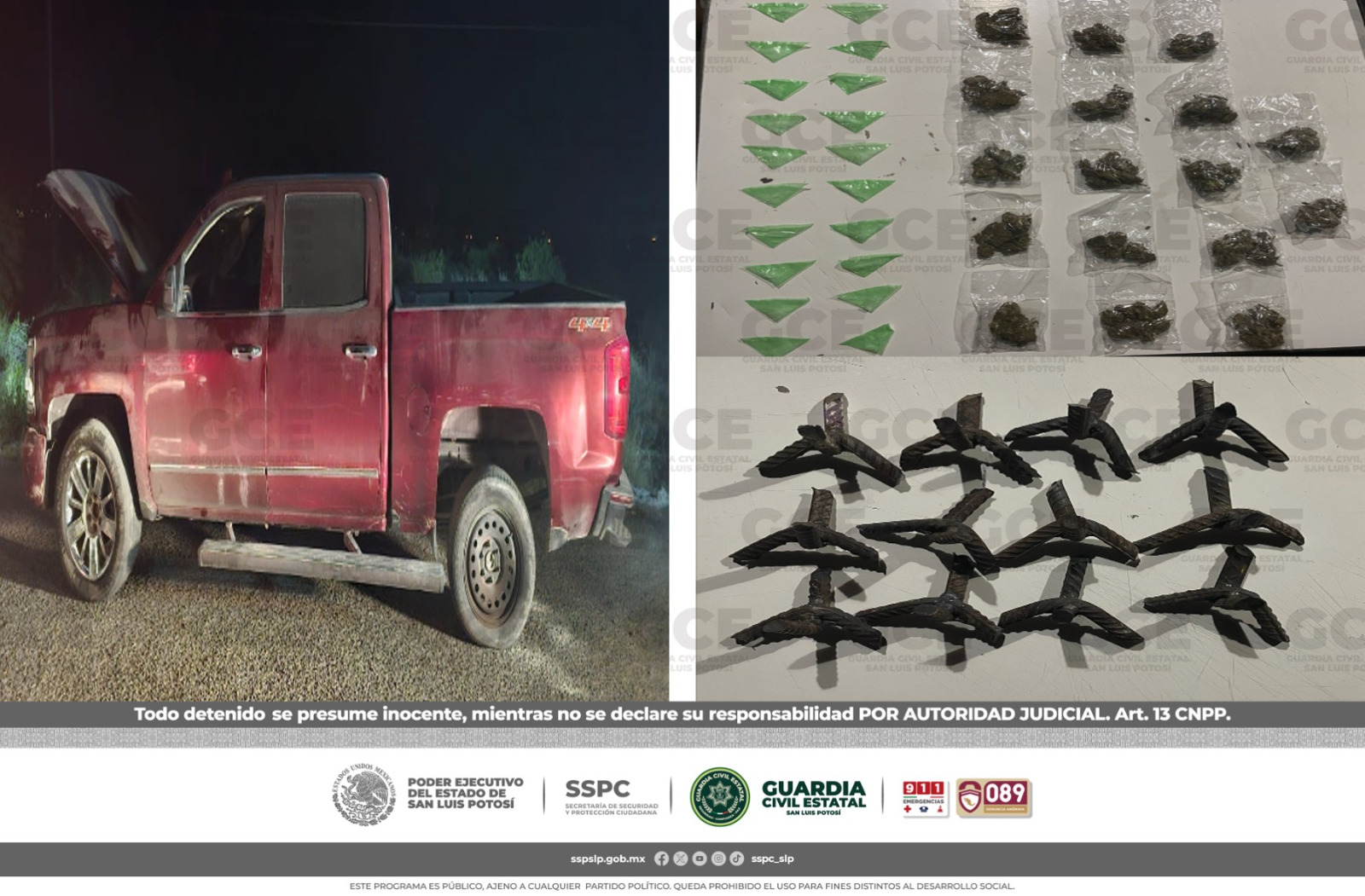Venado, S.L.P.- Labores de seguridad, desarrolladas por agentes de la Guardia Civil Estatal (GCE) para inhibir la comisión de hechos delictivos, permitieron el aseguramiento de una unidad que tenía reporte de robo asegurándose droga y artefactos metálicos.