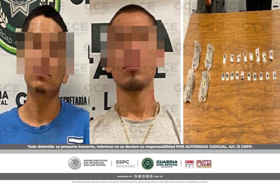 Cárdenas, S.L.P.- Como resultado de las labores operativas, efectuadas por oficiales de la Guardia Civil Estatal (GCE), para el combate al narcomenudeo en la región Media, dos presuntos vendedores de droga fueron detenidos en la colonia Brownsville.