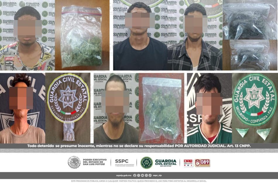 Al continuar con los recorridos preventivos y de seguridad, los agentes estatales detuvieron a Francisco “N” de 31 años por presunta posesión de una bolsa de marihuana en la avenida Curie en la colonia Progreso; los agentes estatales detuvieron a José “N” de 29 años por posesión de una dosis de “cristal” en la calle de Gómez Cipriano, de la colonia Simón Díaz; Celso “N” de 36 años, fue detenido por posesión de una dosis de “cristal” en Camino a la Pila y la carretera a México, en la delegación de La Pila; en el marco de las acciones de seguridad implementadas en el dispositivo Base de Operaciones Mixtas, se lleva a cabo la detención de Carlos “N” de 19 años, por posesión de droga asegurándole una bolsa de marihuana en las calles de Benito Quezada y Mexquitic, de la colonia Wenceslao; Martín “N” de 30 años de edad, es asegurado con dos dosis de “cristal” en el bulevar México-Laredo de la colonia Obrera, en el municipio de Ciudad Valles; los agentes estatales detuvieron a Edgar “N” de 30 años por llevar consigo una bolsa de marihuana en la calle de Géminis, de la colonia Real Campestre, en el municipio de Ciudad Valles; Tomás “N” de 22 años, fue detenido en el tramo estatal Ahuacatitla-Axtla de la localidad Barrio Ortega, en el municipio de Axtla De Terrazas con tres bolsas de marihuana; Jonathan “N” de 23 años, fue detenido con dos bolsas de marihuana en la calle de Flor de Dalia de la colonia Puente del Carmen, en el municipio de Rioverde; César “N” de 22 años, fue asegurado con tres bolsas de marihuana en la carretera federal 80, en Puerto de Lobos, Ciudad del Maíz y Juan “N” de 21 años, fue detenido con dos dosis de “cristal” en la calle de Lerdo de Tejada de la colonia Arboledas, en el municipio de Matehuala.