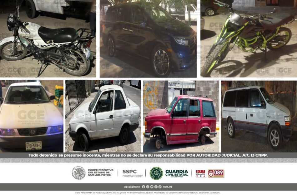S.L.P.- Mediante los operativos de seguridad, efectuados por la Guardia Civil Estatal (GCE), siete unidades que tenían reporte de robo fueron aseguradas en la capital potosina, así como en los municipios de Soledad de Graciano Sánchez y Santa María del Río.