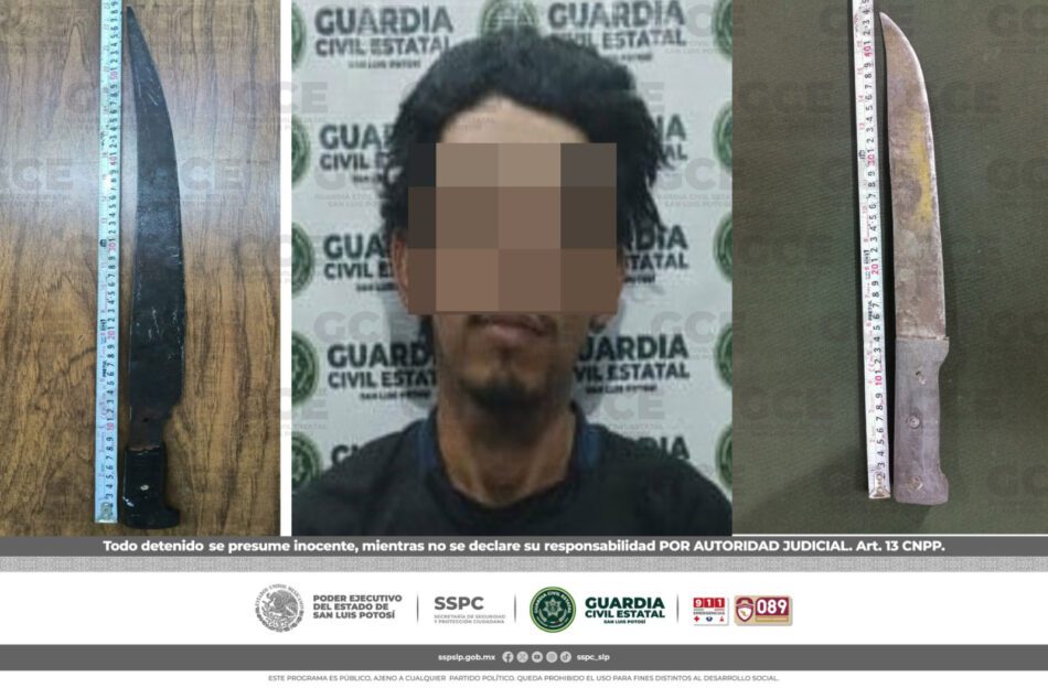 Una de las detenciones tuvo lugar en la colonia Las Flores, ahí fue detenido Rodolfo “N” de 35 años de edad, luego de asegurarle un machete con el que deambulaba en esta zona; mientras que en el municipio de Soledad de Graciano Sánchez, en la colonia Praderas del Maurel, se detuvo a un joven de 15 años, luego de asegurarle un machete de 58 centímetros.