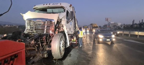 Se trató del tacto marca Freightliner, color blanco, con placas de circulación para el servicio de carga, acoplado con dos semirremolques color azul, cargados a su máxima capacidad con pollo congelado, el cual era conducido en dirección de norte a sur, sin embargo, al estar al paso del punto antes mencionado, por causas que se desconocen, su operador perdió el control del tracto, chocó en la parte posterior de una plataforma cargada y tapada con una lona, jalada por el tracto marca Kenworth Kenmex, color amarillo.