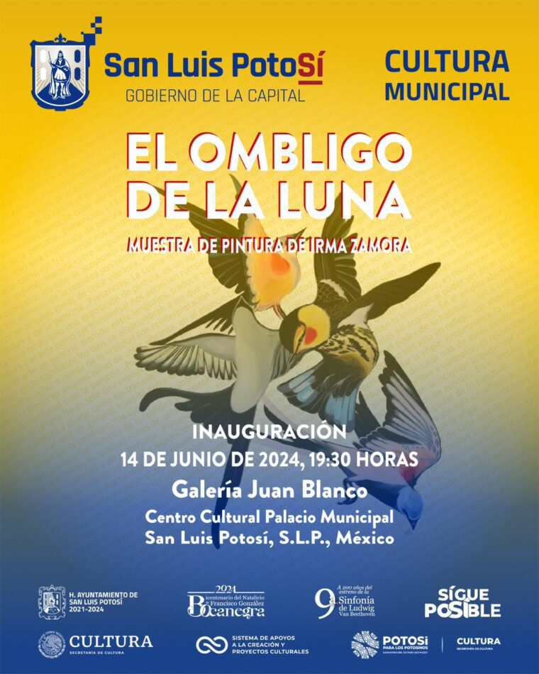 El Ayuntamiento de San Luis Potosí a través de la Dirección de Cultura Municipal invitan al público en general para que visite la exposición El ombligo de la luna, una muestra de pintura de la artista Irma Zamora en la que la autora reproduce manifiestos de la identidad y de la persona, mediante la calidez y alegría de los colores que impregnan en el lienzo un agradecimiento a las almas que brillan a contraluz, y un reconocimiento a la otredad.