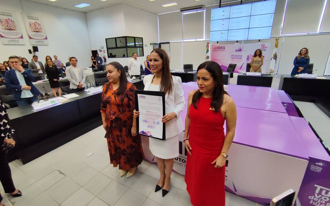 Durante la entrega de su constancia de mayoría, la gobernadora electa estuvo acompañada de su familia, así como del dirigente nacional del PAN Marko Cortés, el dirigente estatal de Acción Nacional Eduardo López Mares. También estuvieron alcaldes y alcaldesas electas del PAN, así como diputados locales electos.