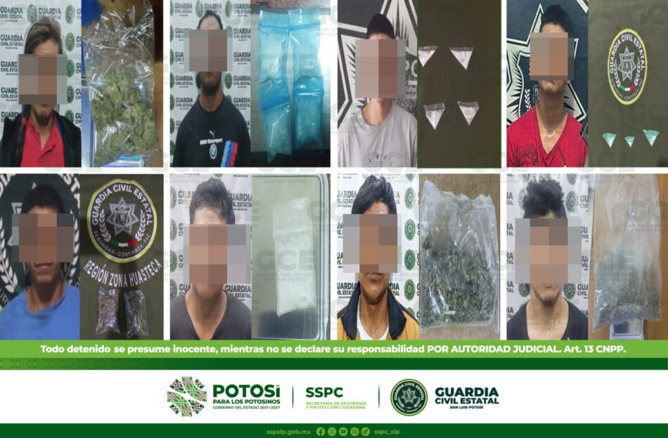San Luis Potosí S.L.P.- Patrullajes de prevención y vigilancia desplegados en las cuatro regiones del Estado potosino, permitieron que durante las últimas 24 horas, agentes de la Guardia Civil Estatal llevaran a cabo el arresto de 15 personas por presuntos delitos contra la salud en su modalidad de posesión de droga.