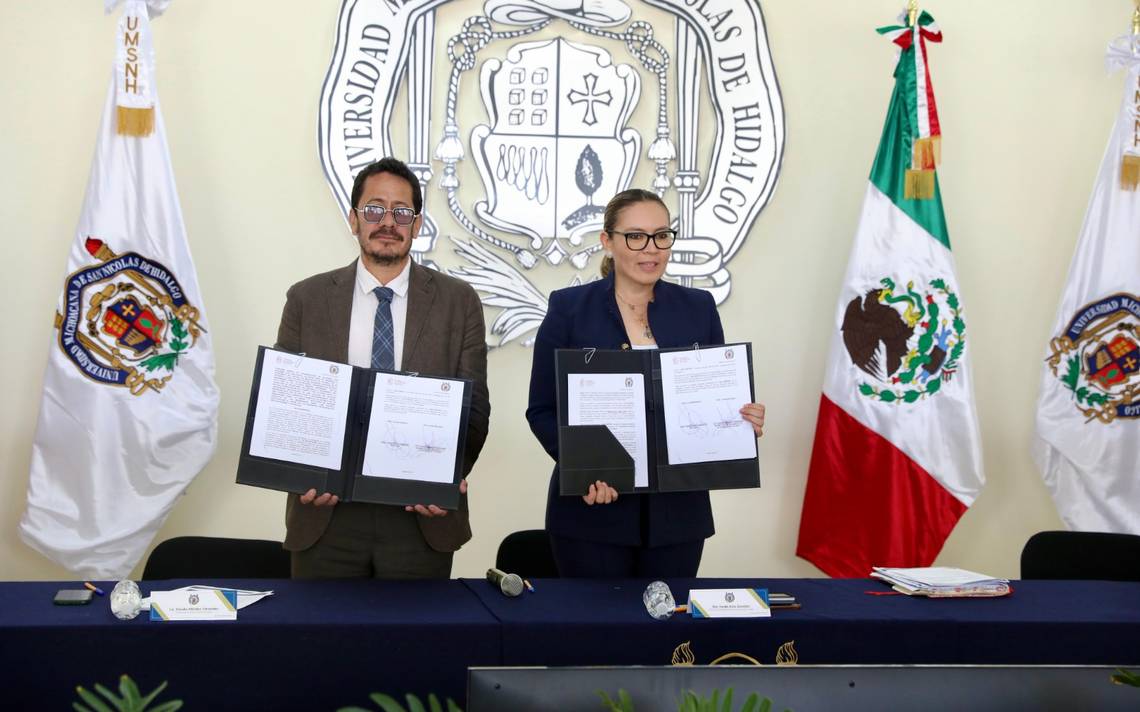 Morelia, Michoacán.- Con la apuesta de impulsar la formación dual y el emprendedurismo en el estudiantado nicolaita, la rectora de la Universidad Michoacana de San Nicolás de Hidalgo (UMSNH), Yarabí Ávila González, y el secretario de Desarrollo Económico (Sedeco) del Gobierno del Estado, Claudio Méndez Fernández signaron un convenio de colaboración.
