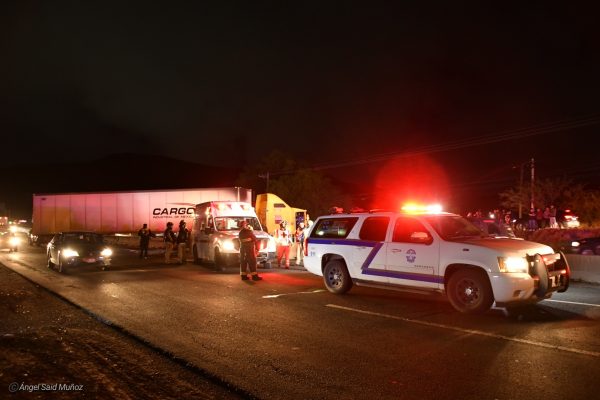 El siniestro ocurrió en el tramo del kilómetro 25, en dirección al centro de la ciudad, sitio donde el tracto camión de la empresa Cargo impactó a una camioneta tipo Suv y un automóvil compacto con placas foráneas, el cual terminó fuera de la cinta asfáltica.