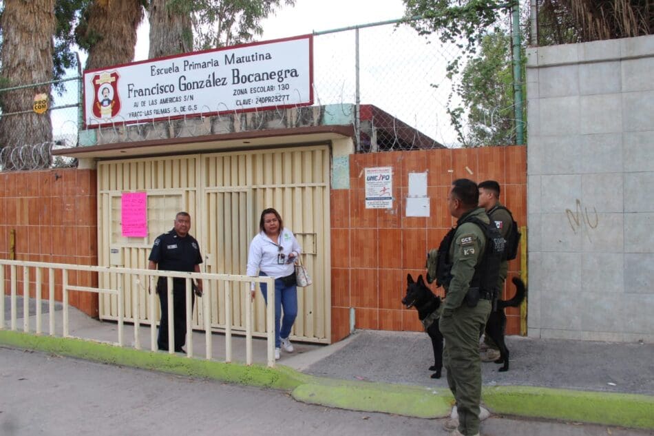 En el marco del operativo “Escuela Segura” que busca brindar seguridad y protección patrimonial a planteles educativos de Soledad de Graciano Sánchez, durante el periodo vacacional, Seguridad Pública Municipal y Educación y Acción Cívica, en coordinación con la Guardia Civil Estatal (GCE) y binomios caninos K-9, realizan recorridos en las instalaciones escolares para conocer información de parte de autoridades directivas sobre las necesidades en materia de prevención y vigilancia.