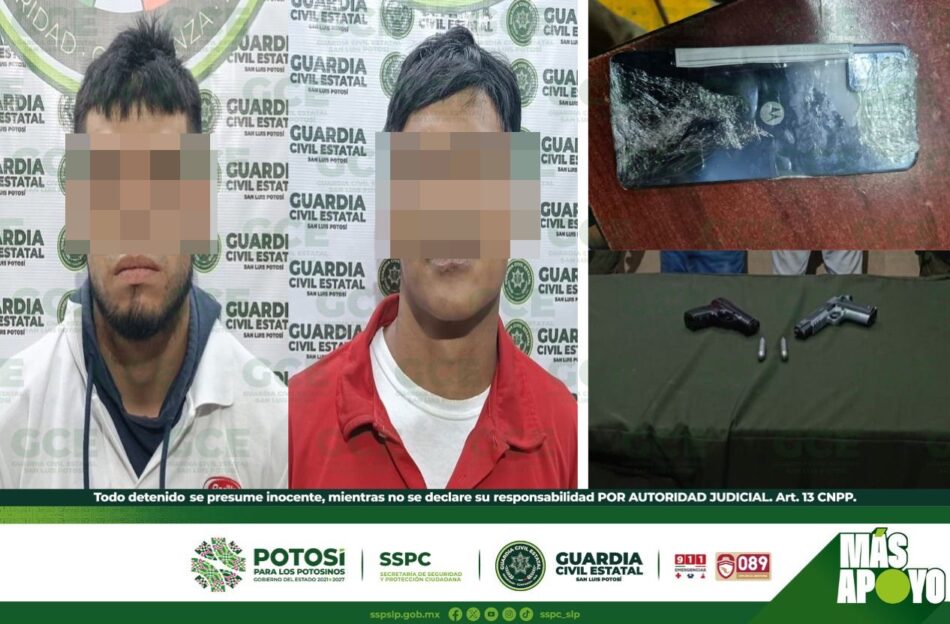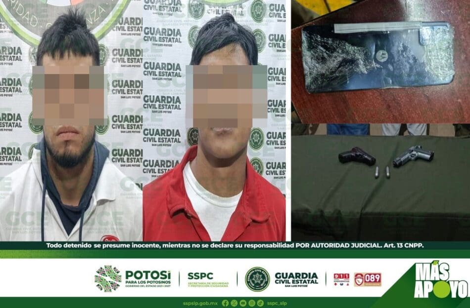 Los presuntos, Irving “N” de 22 años y Jahir “N” de 20 años, presuntamente realizaron un robo con violencia a un transeúnte, amagándolo con armas de utilería para despojarlo de un teléfono celular en las calles de República de Ecuador y República Dominicana en la colonia San Francisco, perteneciente al municipio de Soledad de Graciano Sánchez.