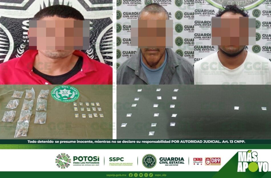 S.L.P.- Operativos de inteligencia, efectuados por agentes de la Guardia Civil Estatal (GCE), dieron como resultado la detención de tres presuntos vendedores de droga, en la capital potosina y en el municipio de Matehuala, logrando asegurarle 43 dosis de diferentes estupefacientes.