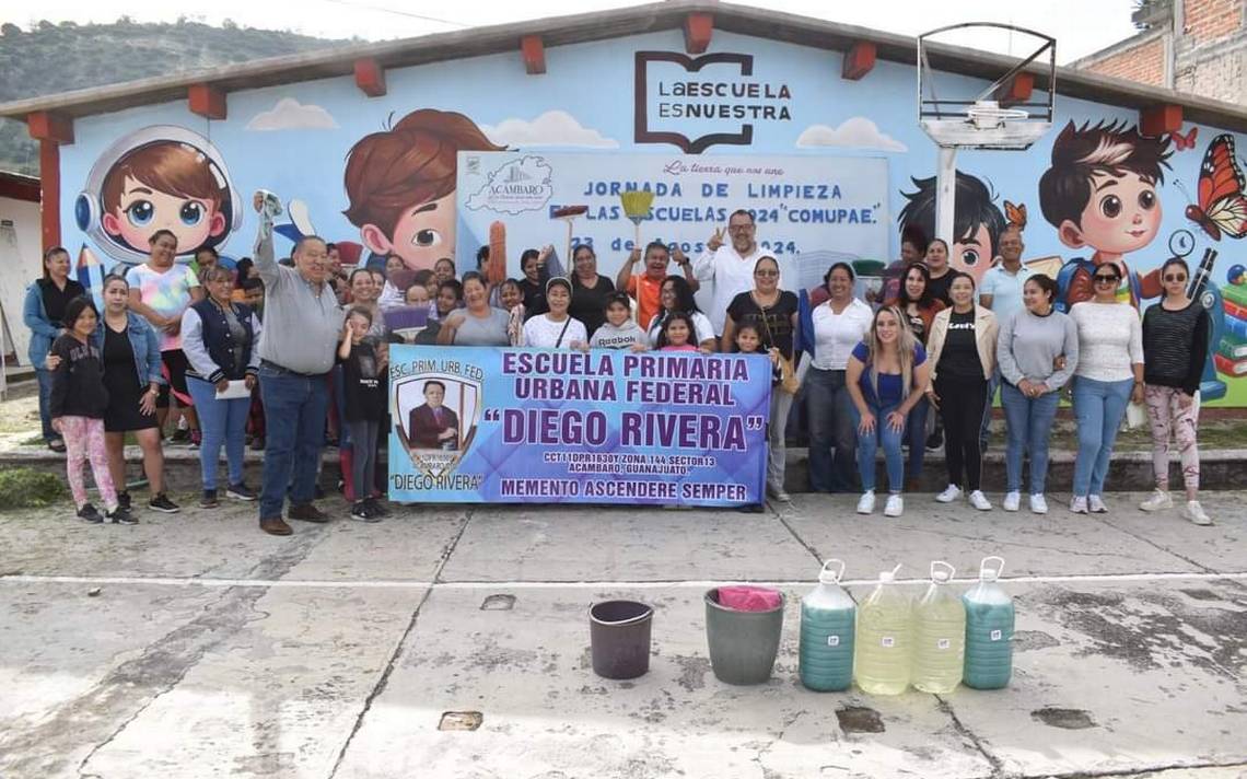 ACÁMBARO, Gto.- Con el propósito de tener en óptimas condiciones los centros escolares para el regreso a clases, se llevó a cabo la jornada de higiene y saneamiento de los planteles con la participación de los COMUPAES, los Comités Participativos de Salud Escolar, personal directivo, docente, de apoyo y asistencia a la educación, padres y madres de familia y autoridades municipales.
