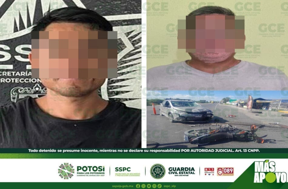 S.L.P.- En distintas acciones, agentes de la Guardia Civil Estatal (GCE) detuvieron a dos personas, por el presunto delito de lesiones, uno de los hechos se suscitó derivado de un accidente de tránsito, en donde el afectado indicó su deseo de proceder legalmente en contra del presunto responsable.