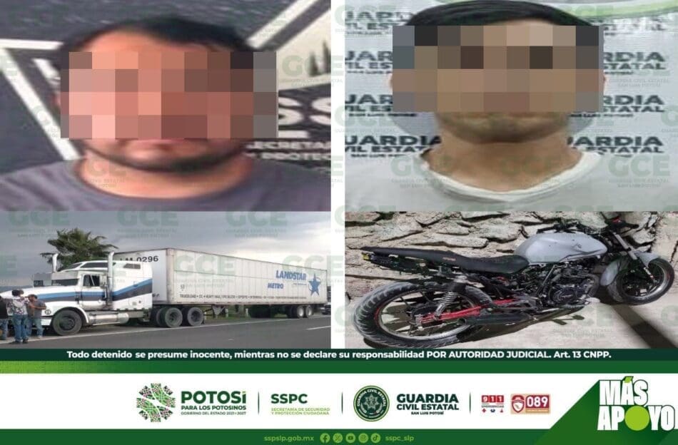 A su vez, en el municipio de Matehuala, efectivos de la GCE detuvieron a Luis “N” de 37 años de edad, luego de que se le asegurara un tractocamión modelo 2020, acoplado a una caja seca, modelo 2019, ambos hurtados en el municipio de Villa de Arriaga.